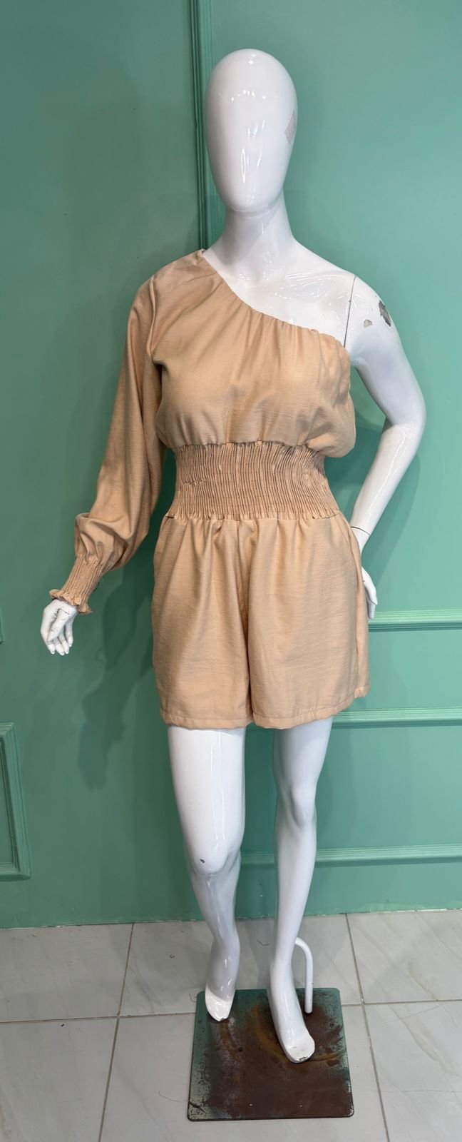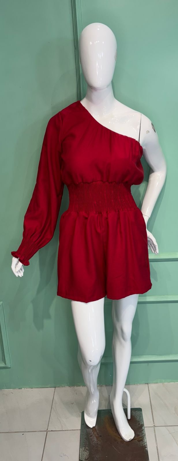 MODELO COM UM OMBRO SÓ ELÁSTEX NO PUNHO,COM BOLSOS FUNCIONAIS E ELÁSTEX NA CINTURA.