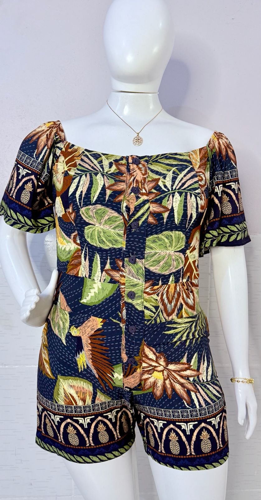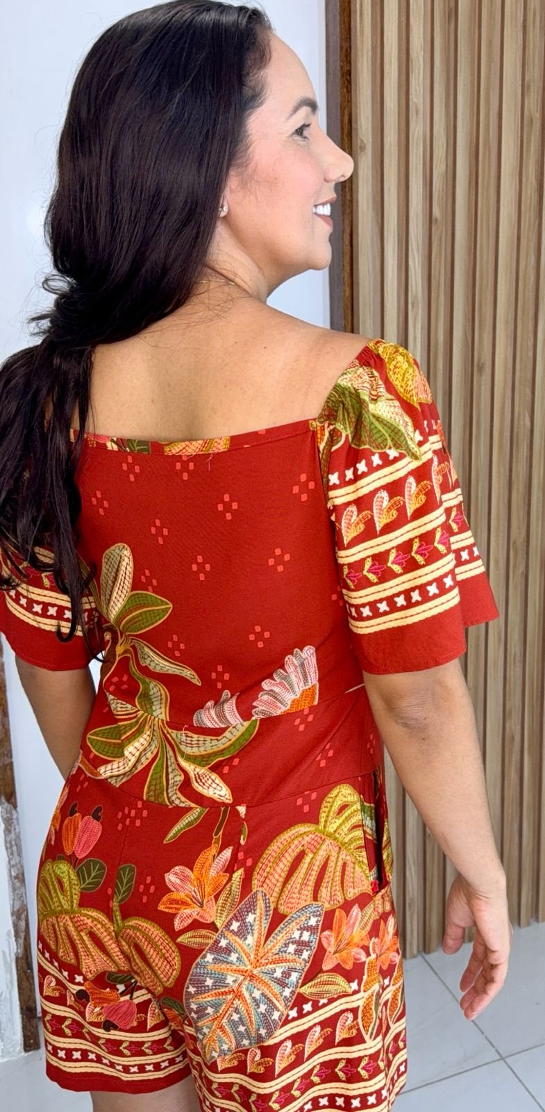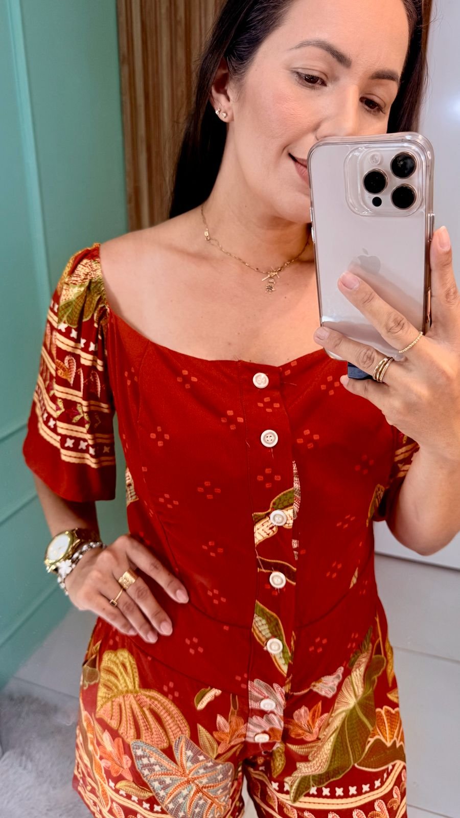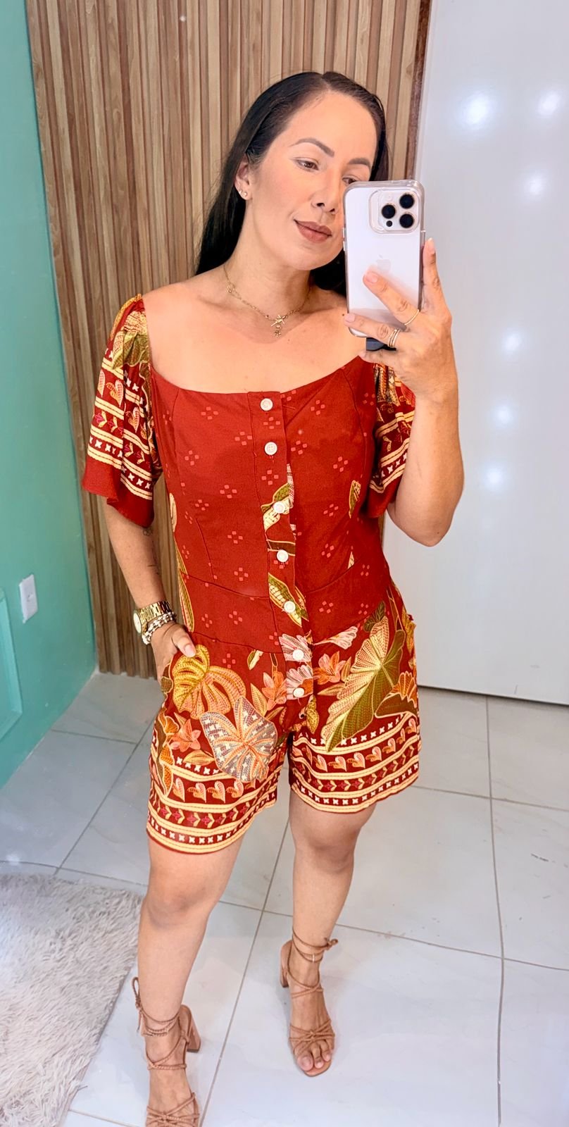 MODELO MACAQUITO COM MANGAS E ELÁSTICO NOS OMBROS, BOTÕES FUNCIONAIS E BOLSOS DA FRENTE, COSTAS FECHADAS.