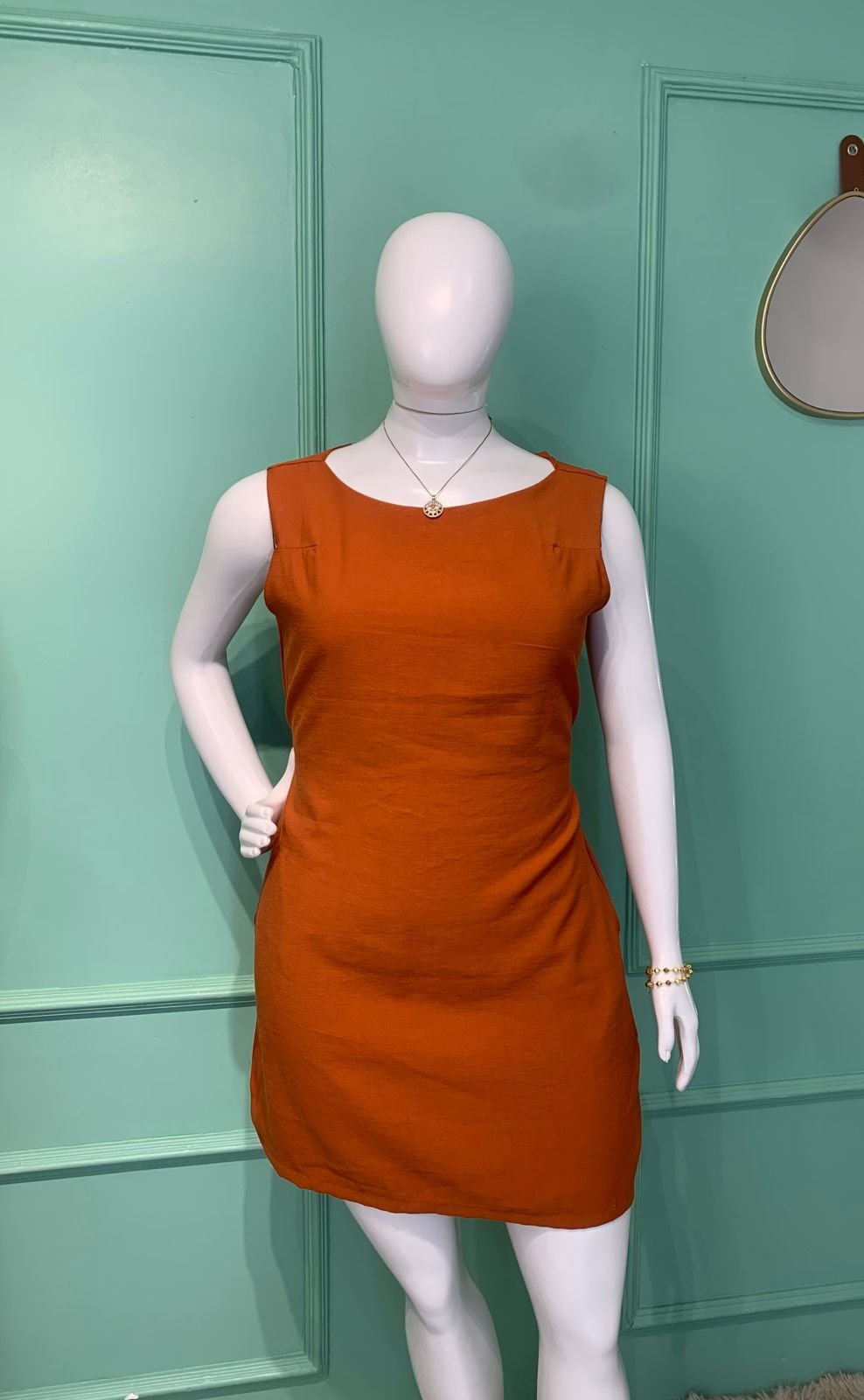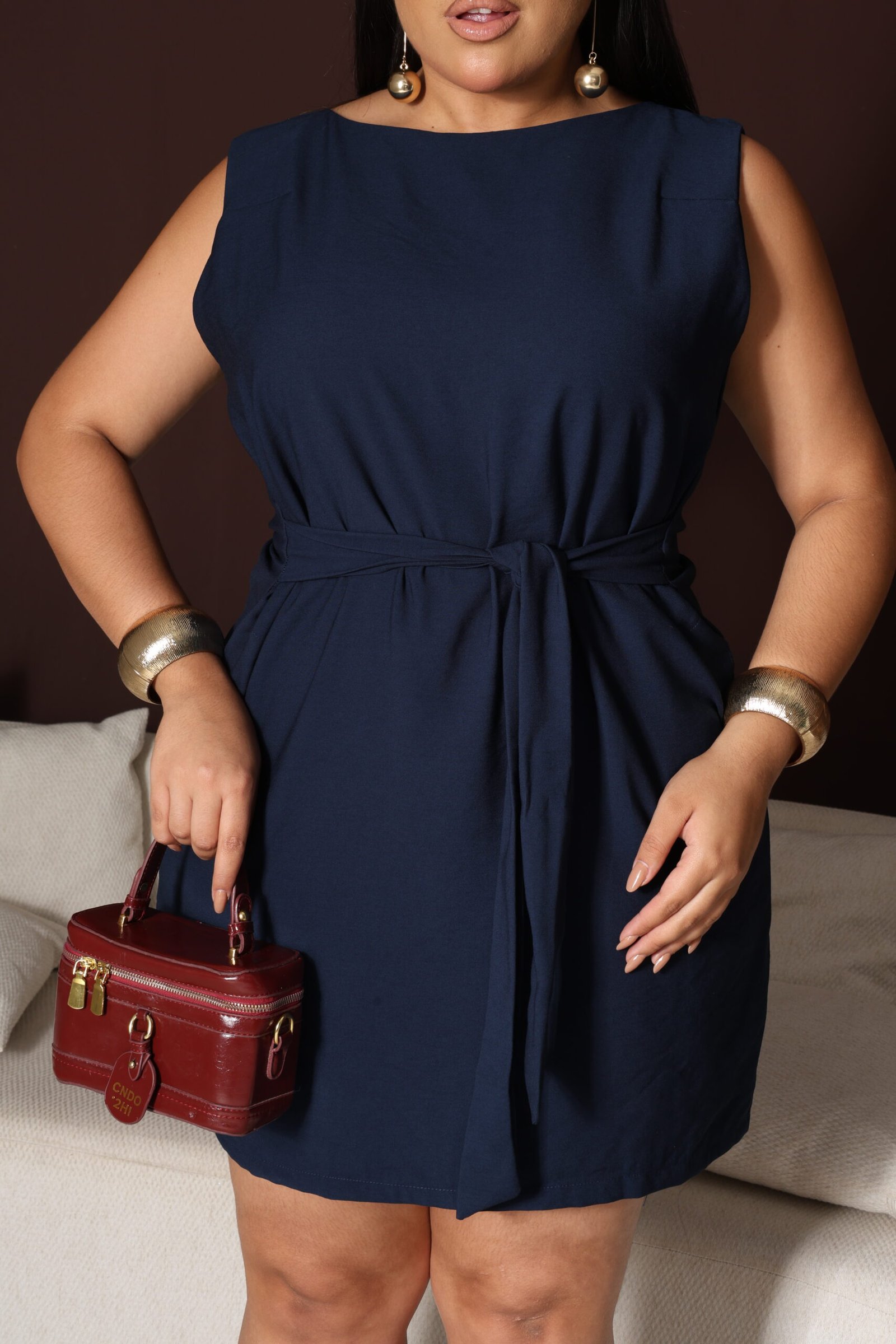 MODELO VESTIDO COM BOLSOS FUNCIONAIS NA FRENTE, CINTO DE AMARRAÇÃO, ALÇAS LARGAS, COSTAS COM UM BOTÃO E FECHADAS.