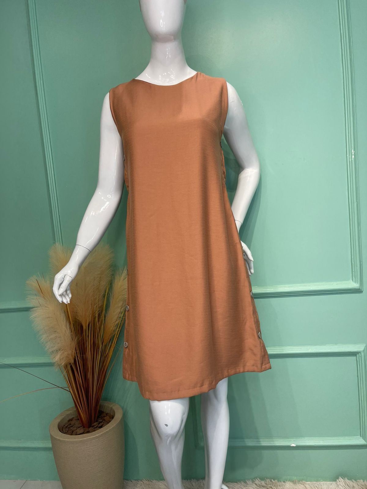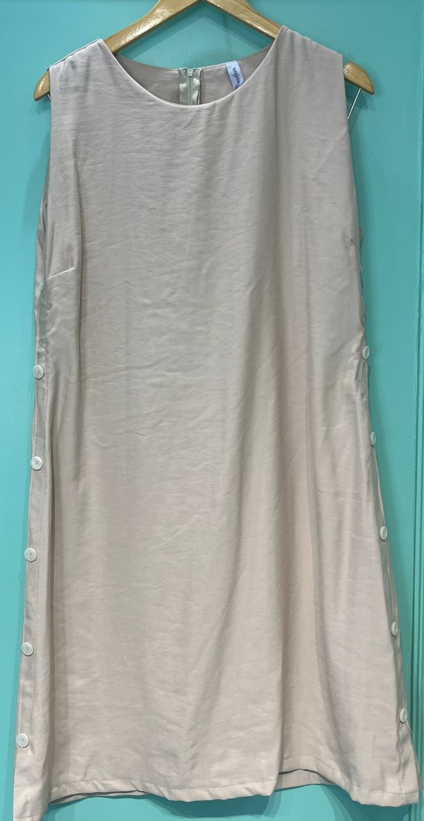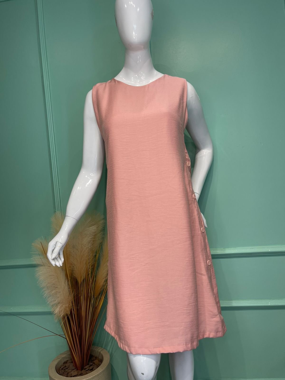 MODELO REGATA, COM ZÍPER NAS COSTAS, BOTÕES DE ENFEITE NA LATERAL TODA, DECOTE CANOA.