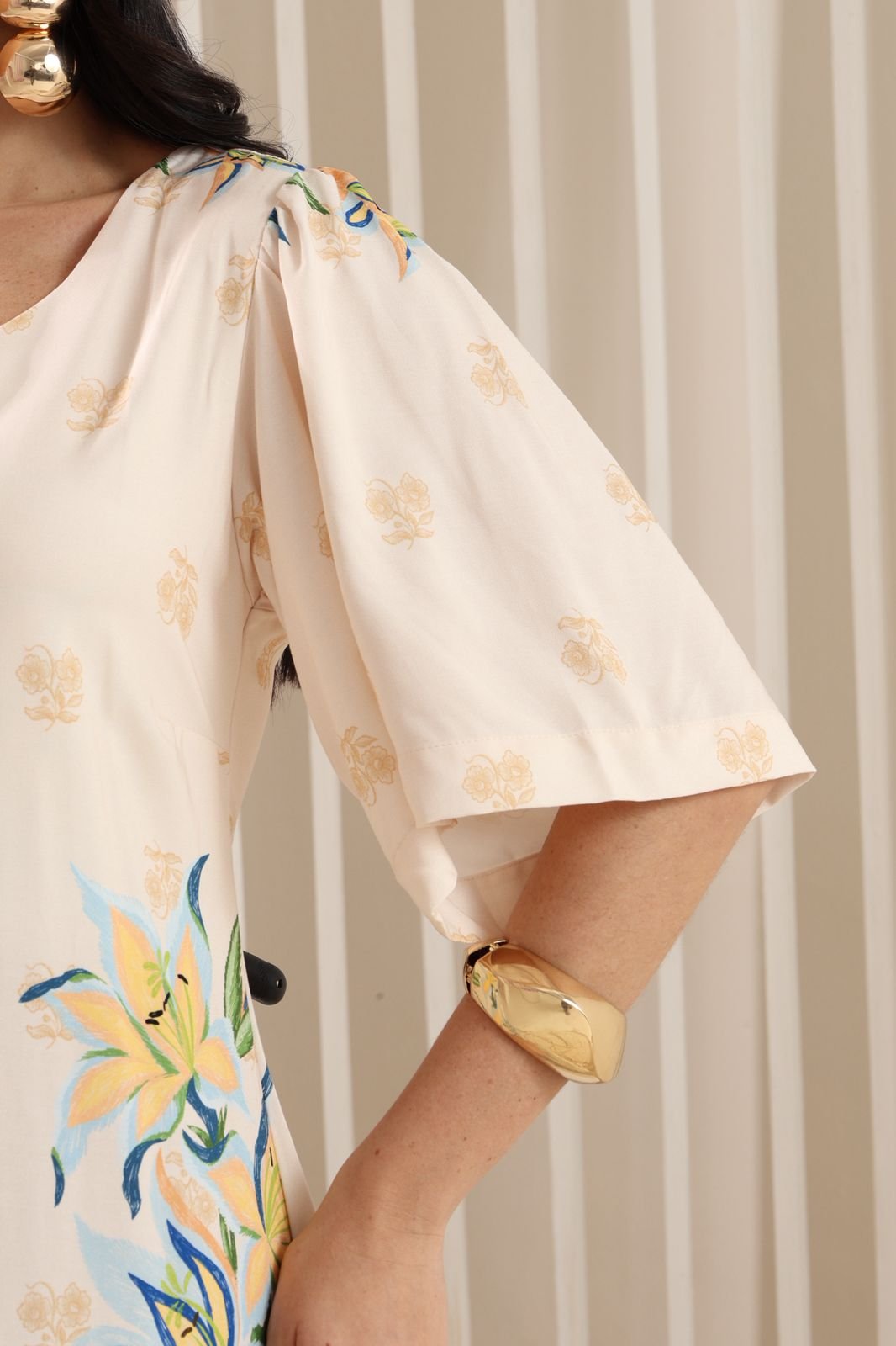 MODELO COM MANGAS AMPLAS, DECOTE CANOA, COSTAS COM ELASTEX E AMARRAÇÃO.