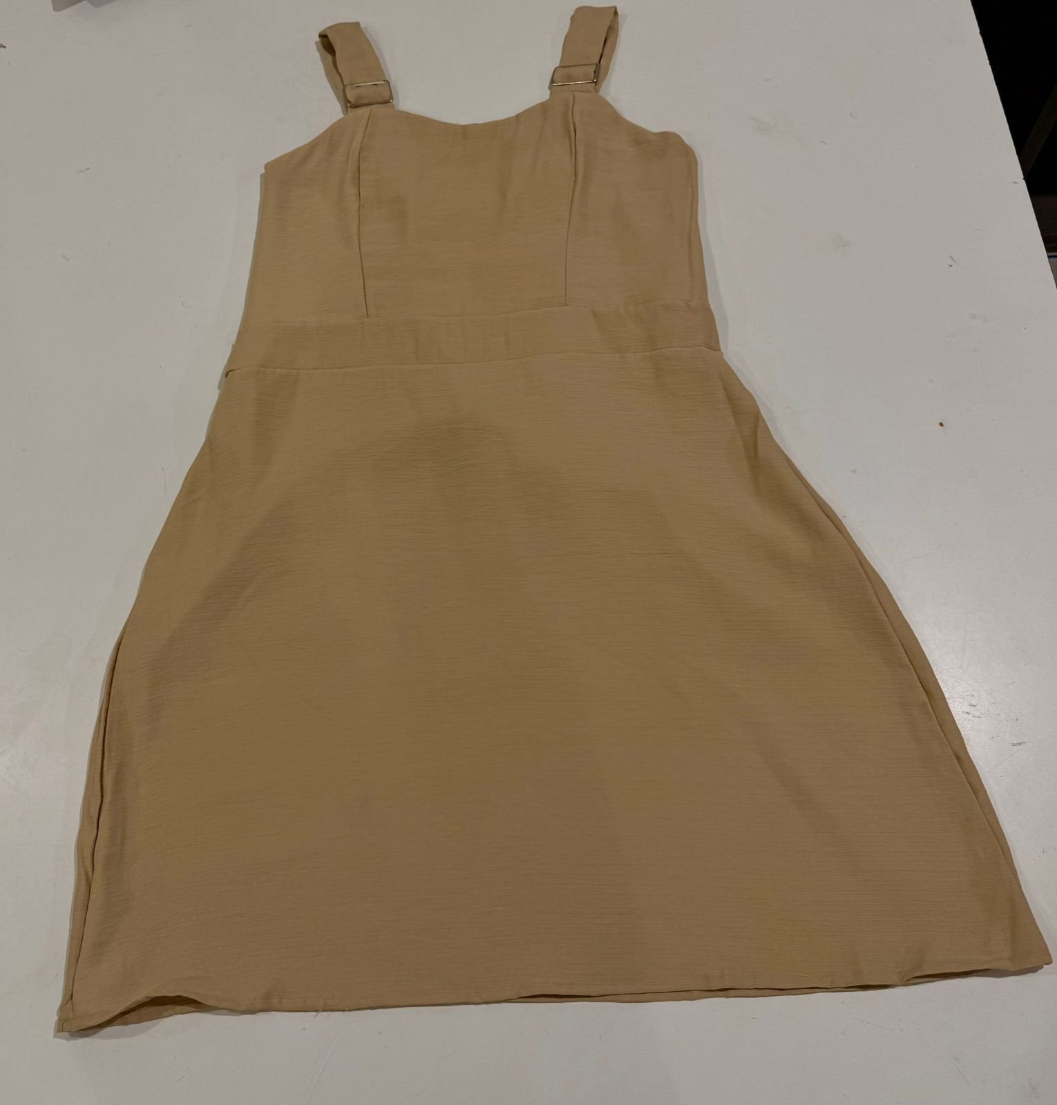 VESTIDO COM FIVELA NAS ALÇAS, COSTAS EM ELASTEX, CÓS ABAIXO DO BUSTO.