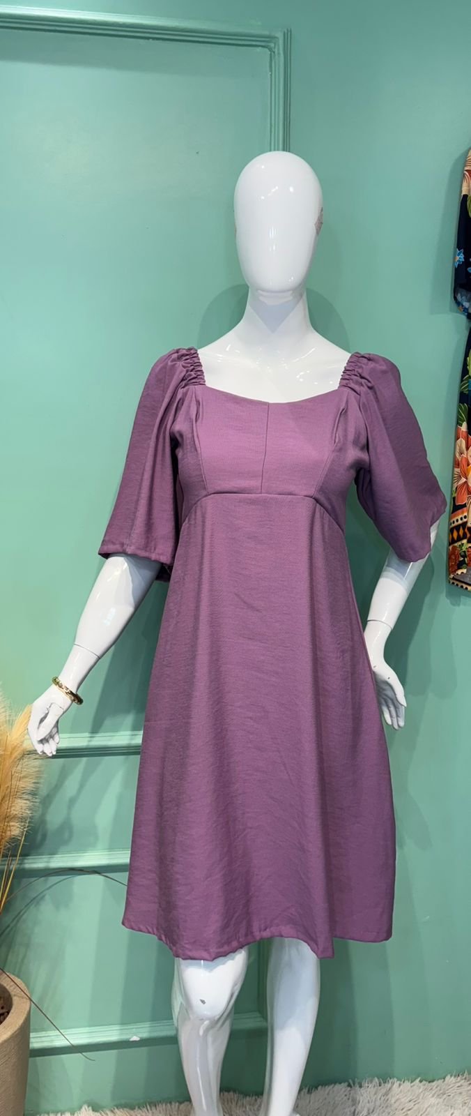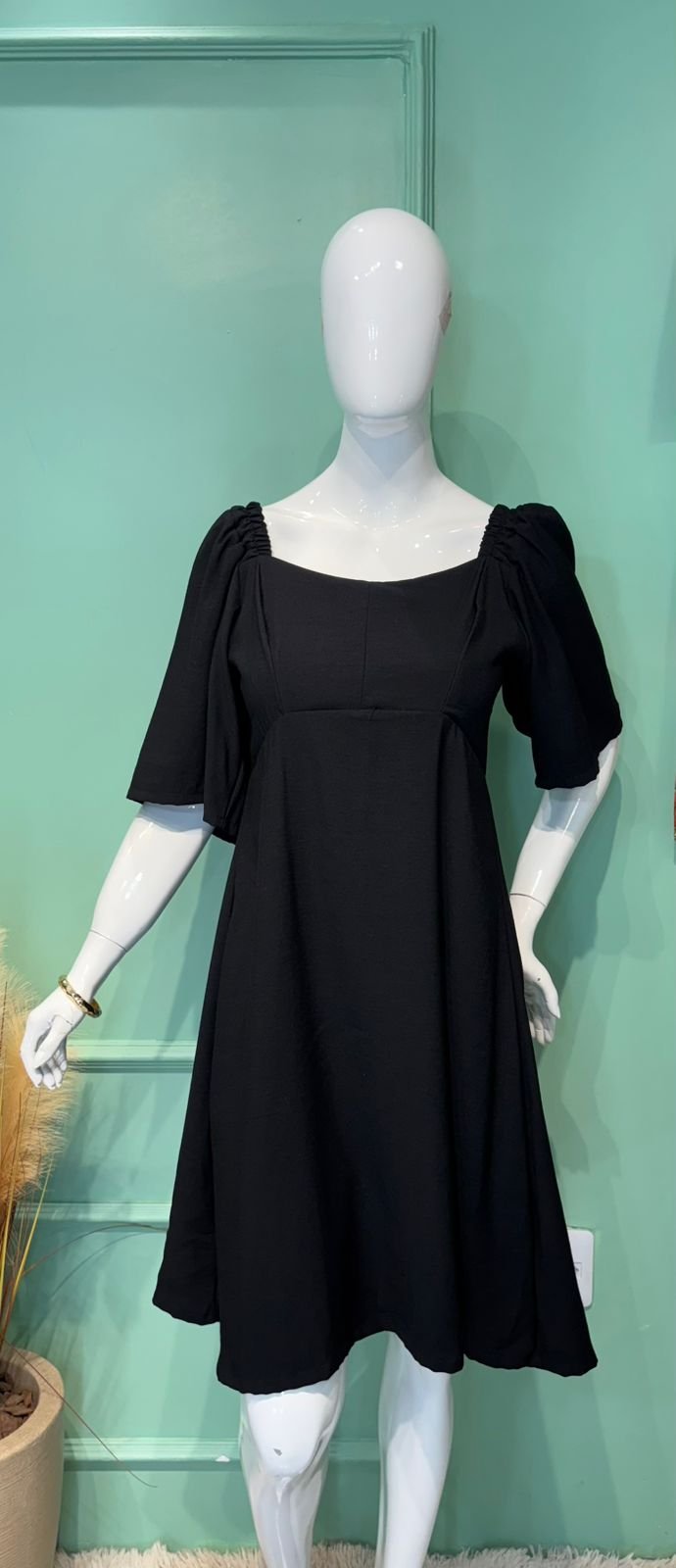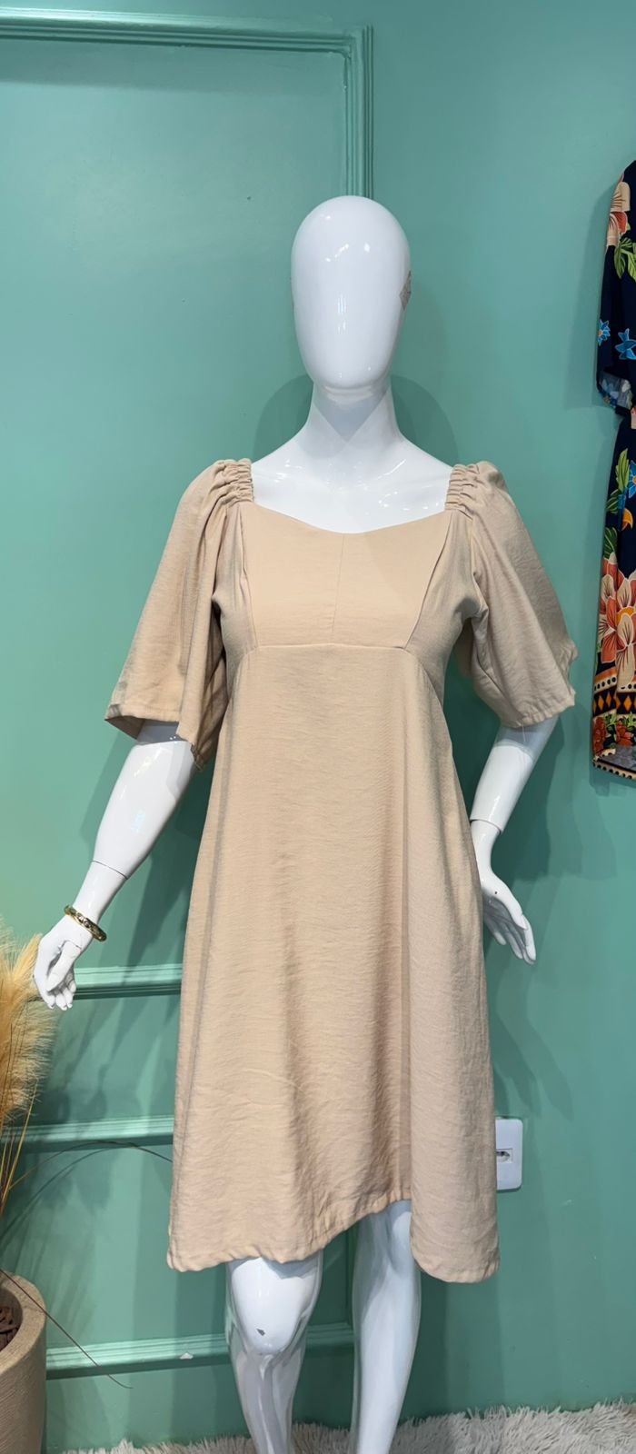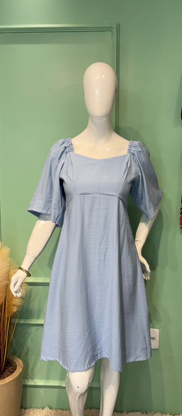MODELO COM DECOTE REDONDO, DATALHE NO BUSTO, MANGA COM ELÁSTICO E ELÁTEX NAS COSTAS.