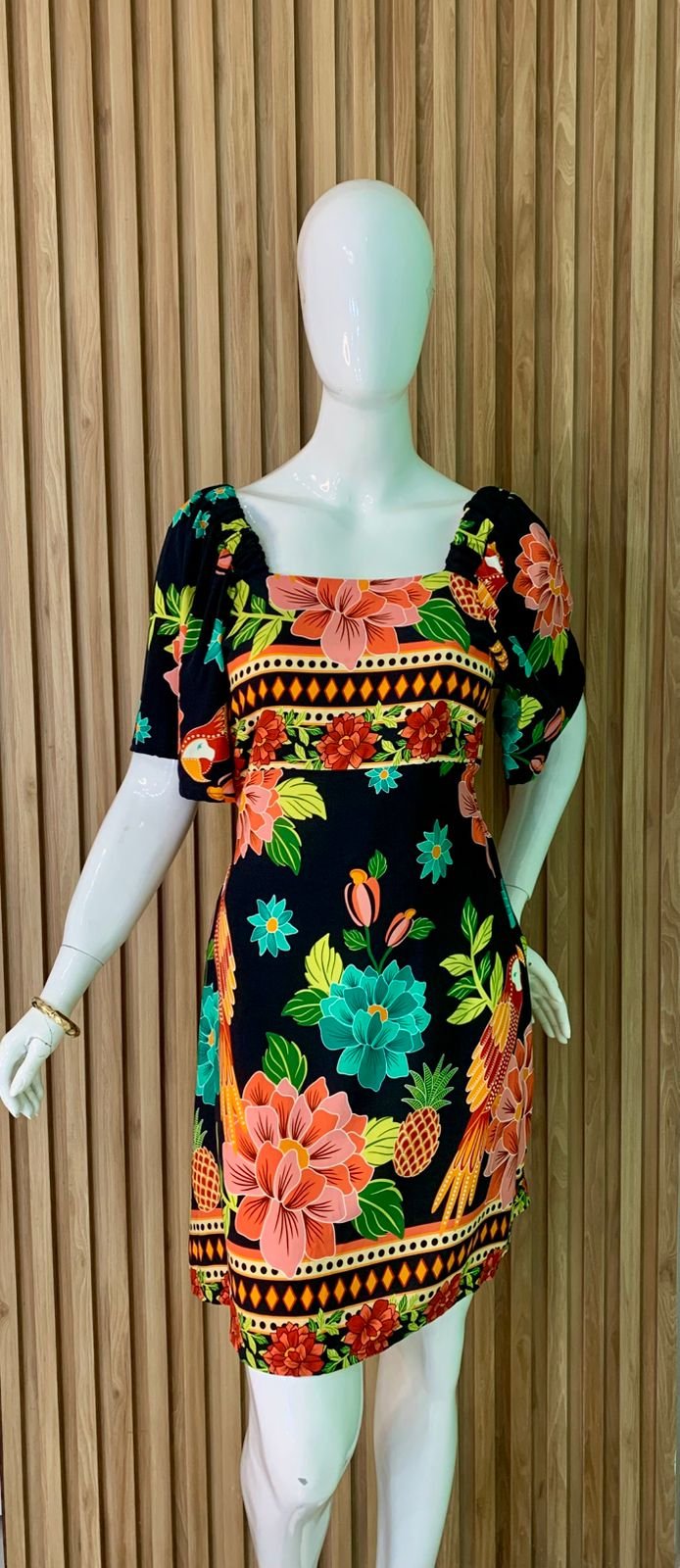 MODELO VESTIDO COM ELÁSTICO NOS OMBROS, MANGAS AMPLAS, COSTAS COM ELASTEX E FECHADAS.