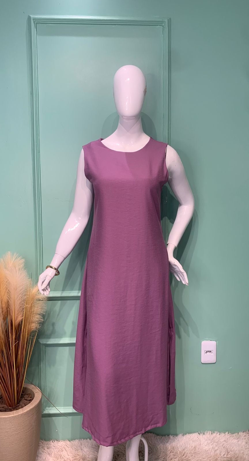 MODELO REGATA, GOLA RIBANA, COM FENDA NA LATERAL, ZÍPER NAS COSTAS E BOLSOS FUNCIONAIS.